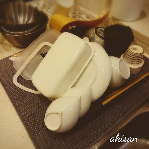 水切りカゴをやめた話を書きました。akisan01.hatenablog.jp 夕食の片付け後 我が家の夕食後は食器が山盛り。 洗ったあとのありのままの写真です。 最初にお椀等を伏せて置き、そのまわりに小鉢やお皿などをなるべく立てかけていきます。 このとき気を付けな…